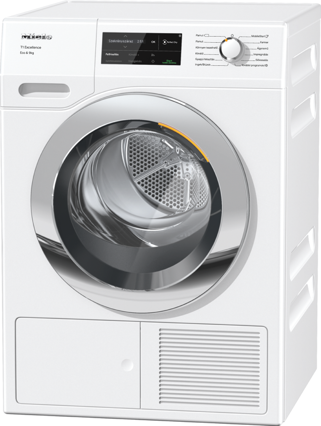 T1 hőszivattyús szárítógép: 1–9 kg-os ruhatöltet és Miele@home az okos textilápoláshoz.